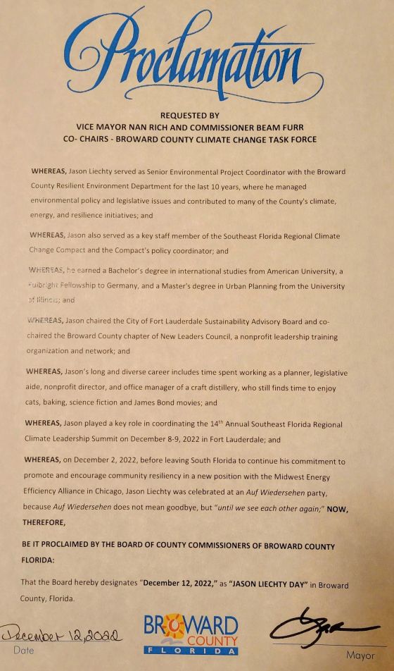 "Jason Liechty Day" proclaimed for December 12, 2022, by the Broward County Commission, in honor of ten years of service to Broward County Government.