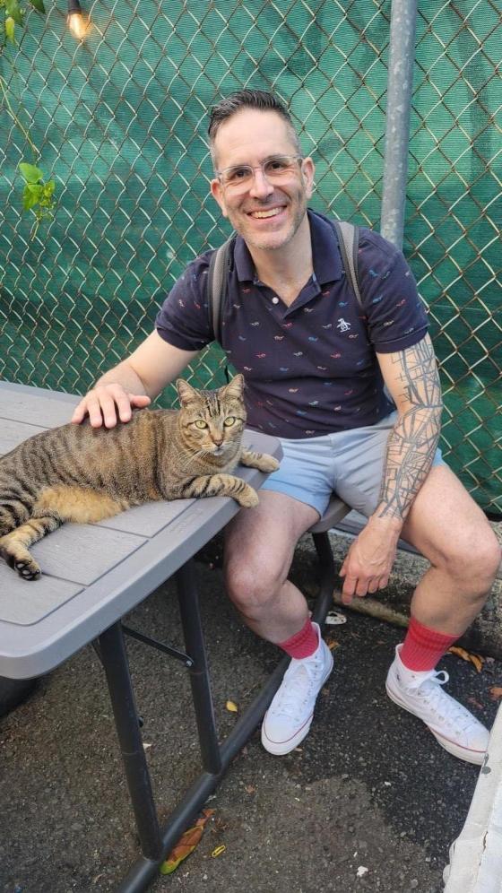 He is an avid baker (including baking-for-hire via his hobby business, Hot Mess Bakery) and the favorite employee of his two housecats, Clark and Cora.
